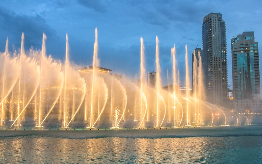 Essa fonte dançante em Dubai mede cerca de 900 pés de altura! Para um show na fonte de Dubai, são usados cerca de 25 projetores coloridos e 6.600 luzes brilhantes em cinco círculos e dois arcos. Durante uma apresentação de cinco minutos, a fonte projeta jatos pesados de água no ar, que balançam e se movem em vários padrões e ritmos coreografados ao som de músicas cativantes como Thriller, de Michael Jackson!