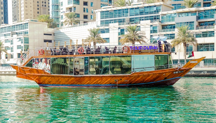 Доу - это деревянные лодки, которые когда-то использовались для торговли вдоль Персидского залива. Сегодня они работают как структурированные обеденные круизы с фиксированными маршрутами через Марину, Крик или Дубайский канал.